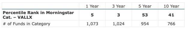 VALLX (3 Year / 5 stars / 1015 funds; 5 Year / 2 stars / 954 funds; 10 Year / 2 stars / 762 funds; )