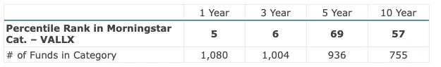 VALLX (3 Year / 3 stars / 1002 funds; 5 Year / 2 stars / 935 funds; 10 Year / 2 stars / 757 funds; )